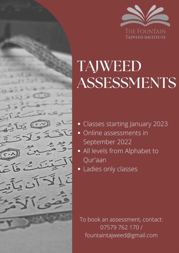 Fountain Tajweed will be holding assessments in late September for any female (16+) wanting to join a Community class.